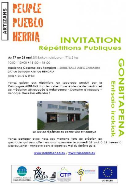 Venez partager avec nous ces moments forts de création du spectacle qui sera offert en avant-première le samedi 25 mai à 22 heures à Gaztelu Zahar À¢'€'" Hendaye dans le cadre du Mai du Théâtre 2013.